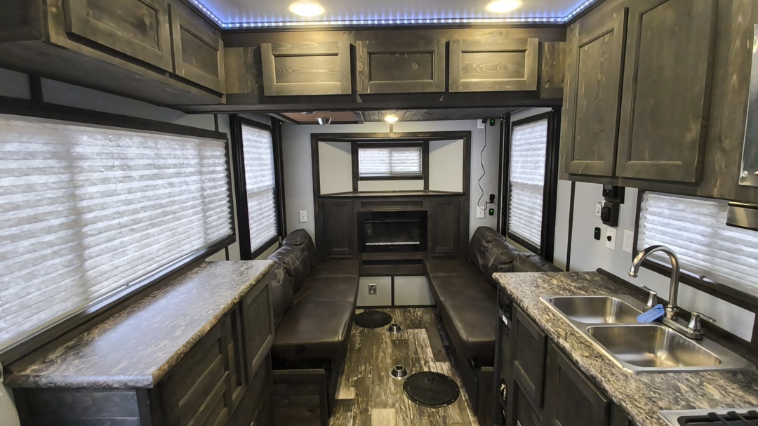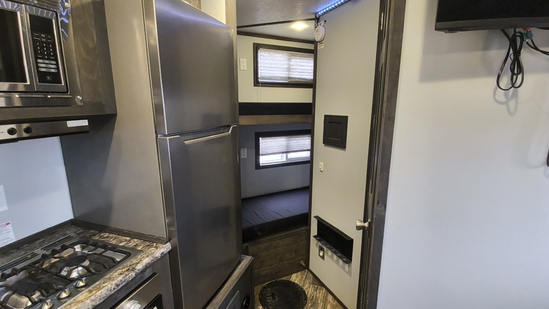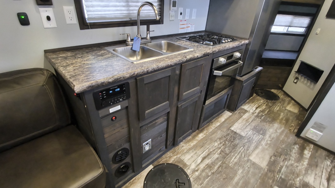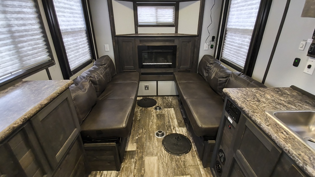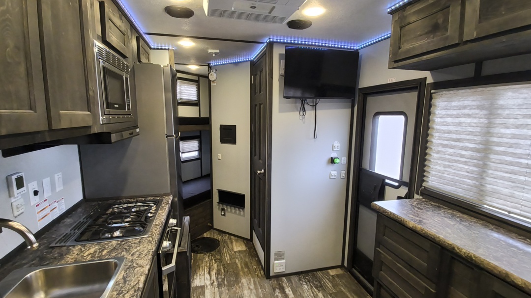 Nice recent trade. Very popular layout with front bunks, full RV, rear booth, galvanized frame, sure step, and more!